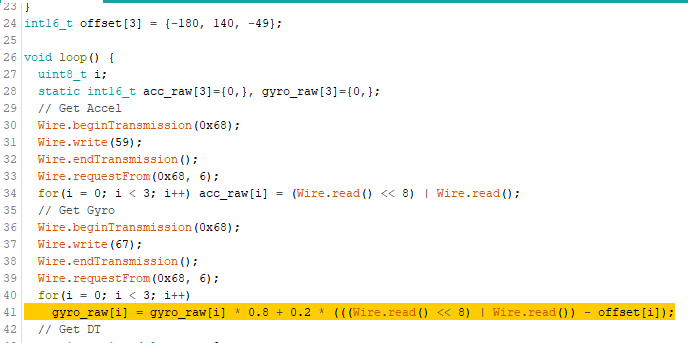 갑자기 코드가 복잡해지기 시작했다. 각가속도는 시간당 회전 각도를 얻은 값이기 때문에 센서를 측정하는 주기를 계산하여 곱한다. gyro_raw[i] / 131.0 을 해주었는데, 131은 데이터시트에서 나온 단위값이다.