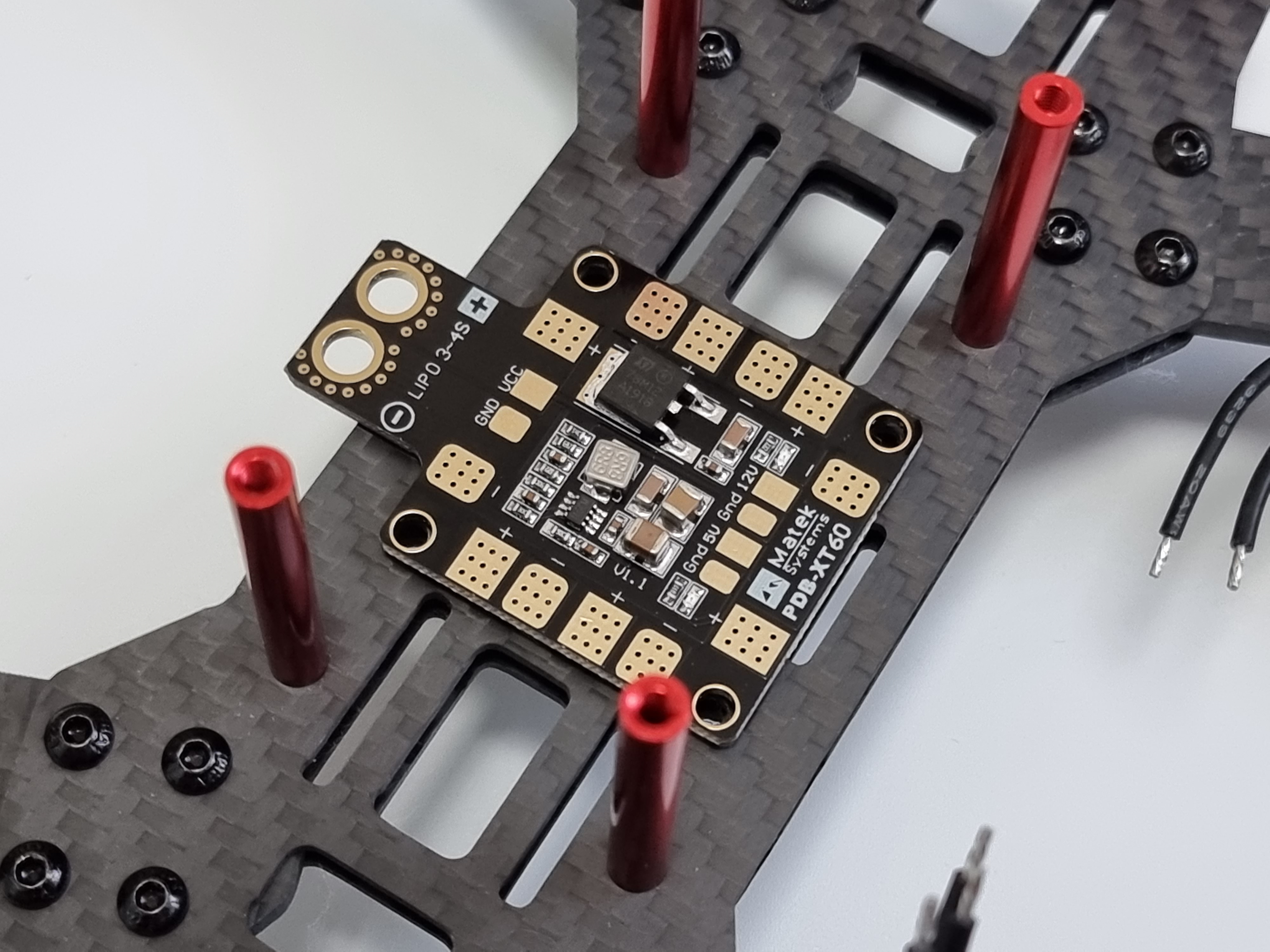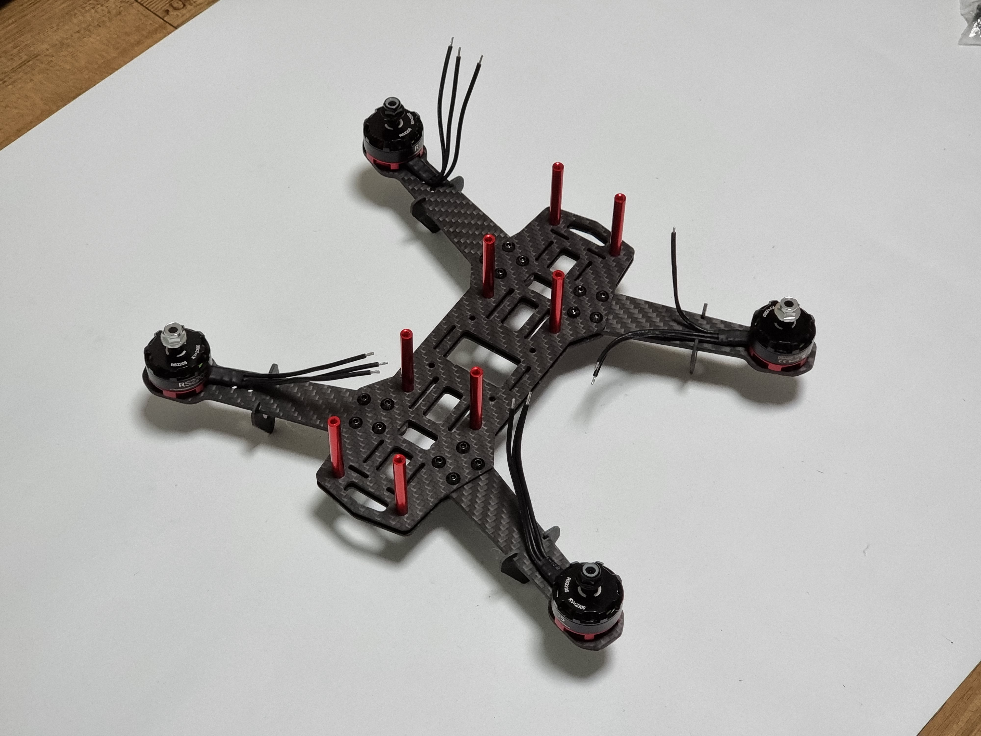 RS2205 모터를 프레임에 장착하고 중앙에 전원 분배 모듈을 고정한다.