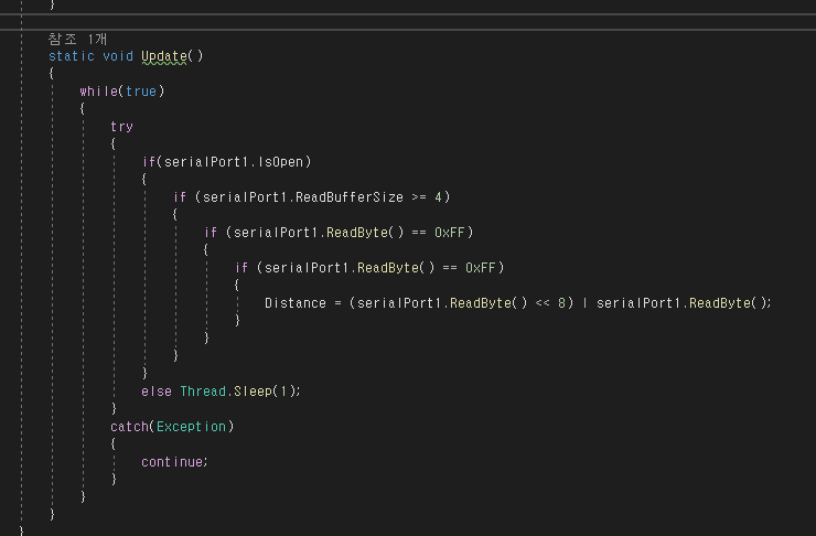 이렇게 실시간으로 초음파의 측정값을 데스크탑 C# 프로그램으로 동기화하여 확인할 수 있다.