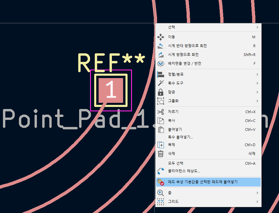 양 끝점에 패드를 추가한 뒤 추가한 각 패드와 코일 객체를 순서대로 클릭하여 속성에 붙여넣기를 클릭한다.