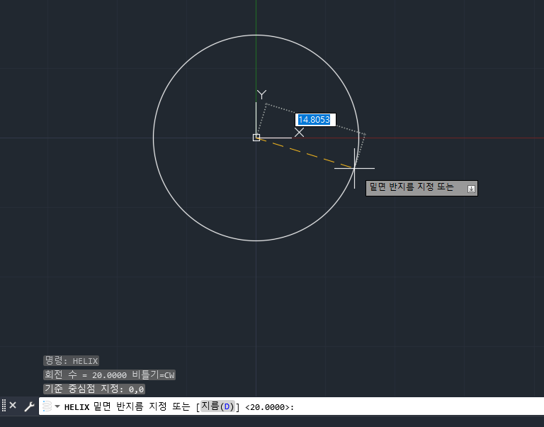 [ HELIX ] 라는 나선 그리기 명령을 실행한다. 이후 내경, 외경을 지정하고 최종 속성 값에 T 명령 설정을 통해 코일의 감은 횟수를 지정한다.